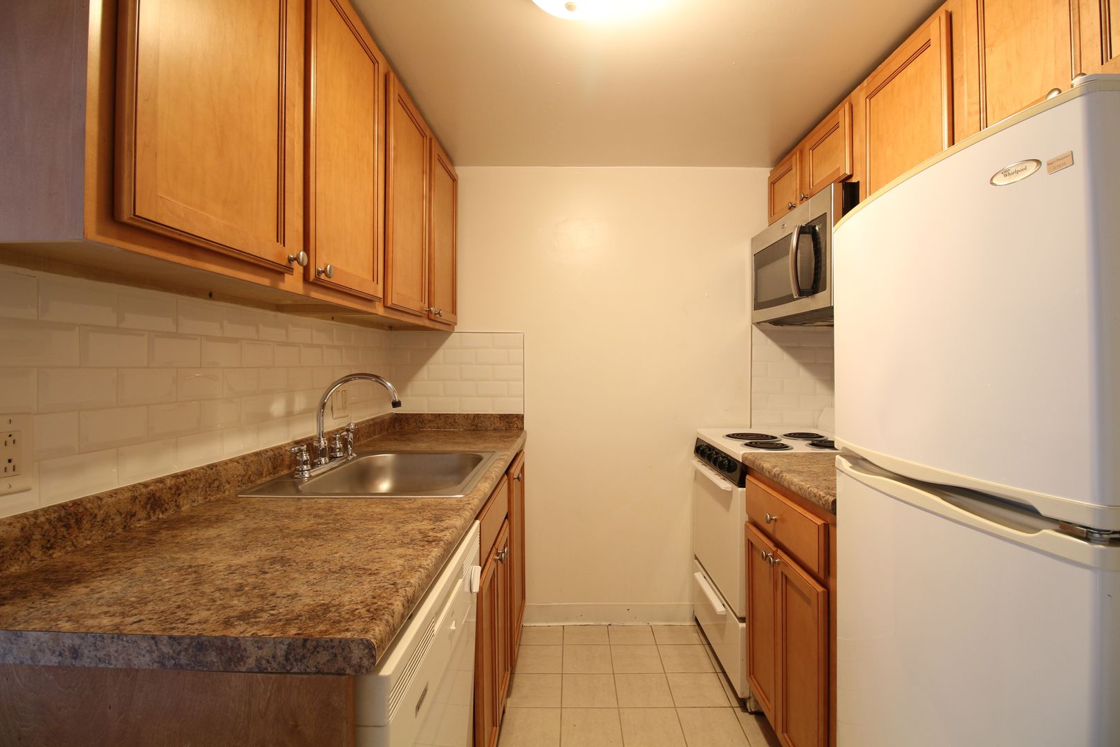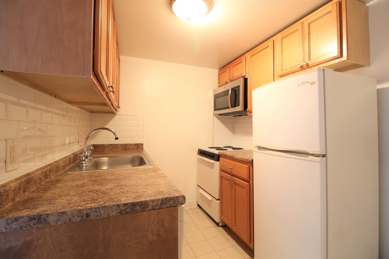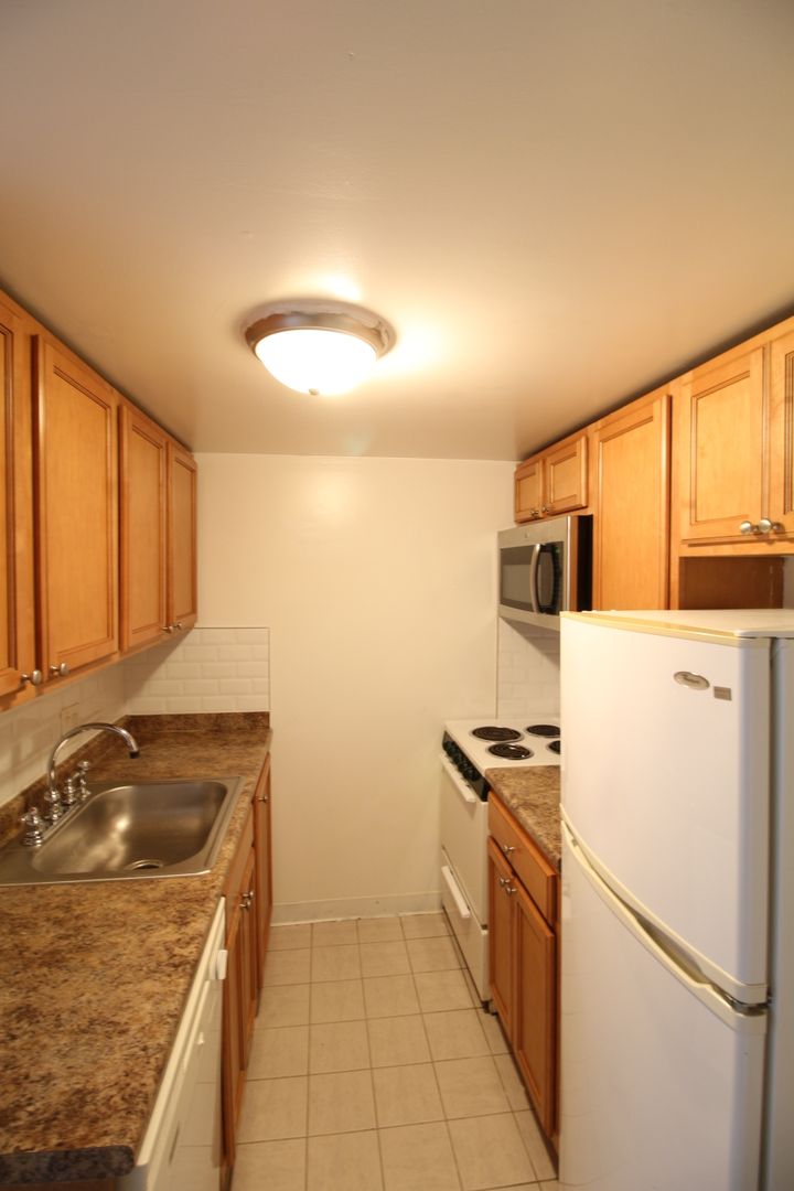 The unit includes a modern, updated kitchen with sleek fixtures and full appliances, including a garbage disposal, built-in microwave, and electric stove. Hardwood floors run throughout the apartment, complemented by a renovated bathroom and ample closet space.