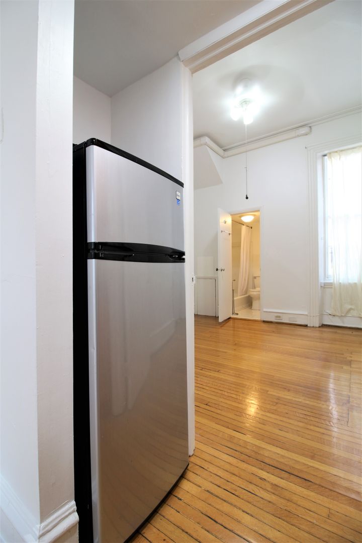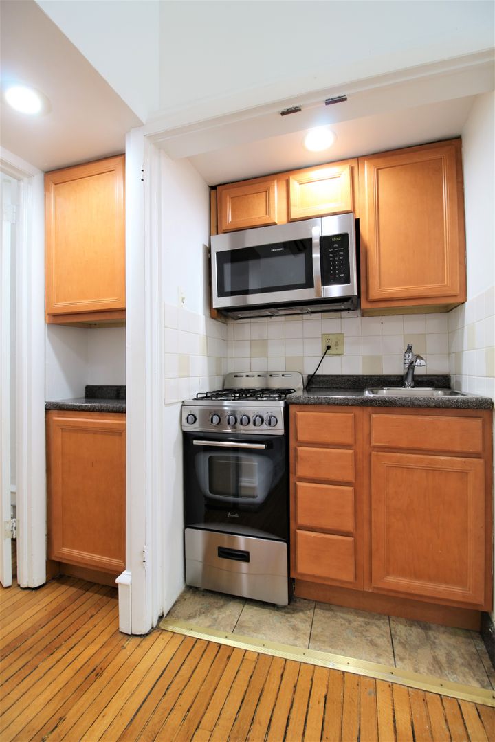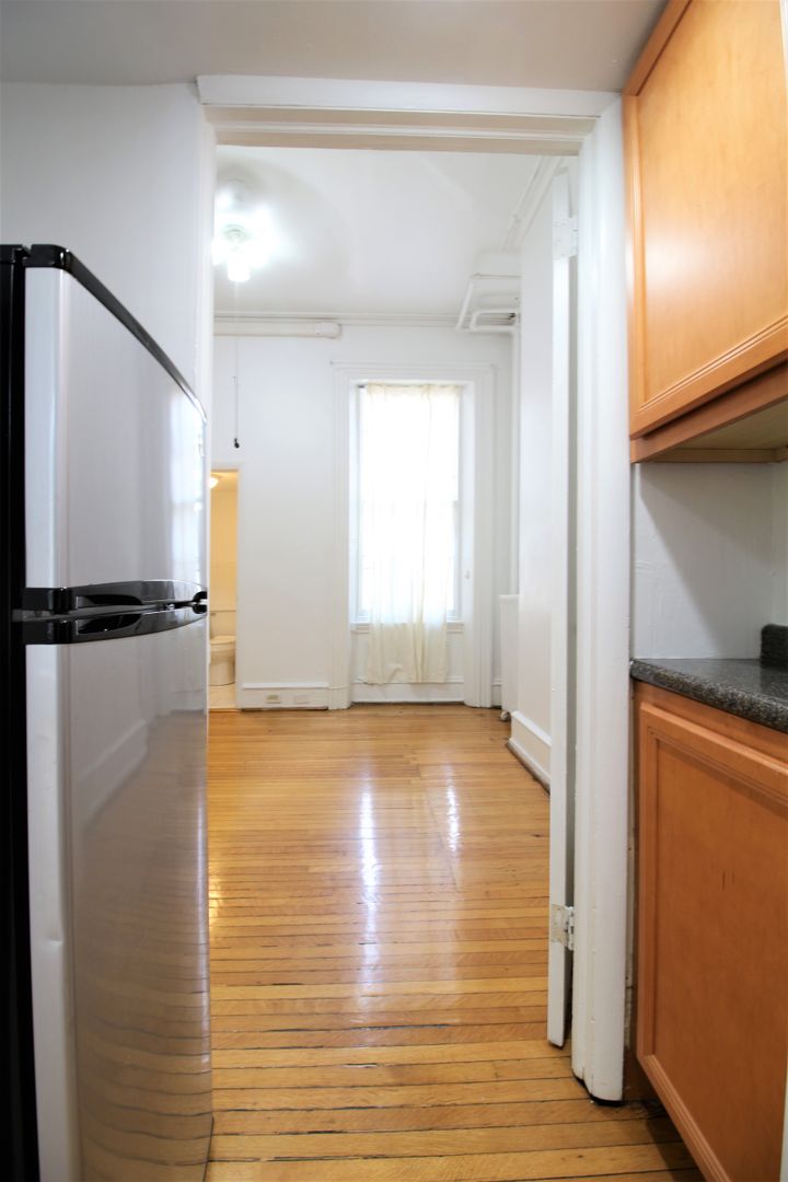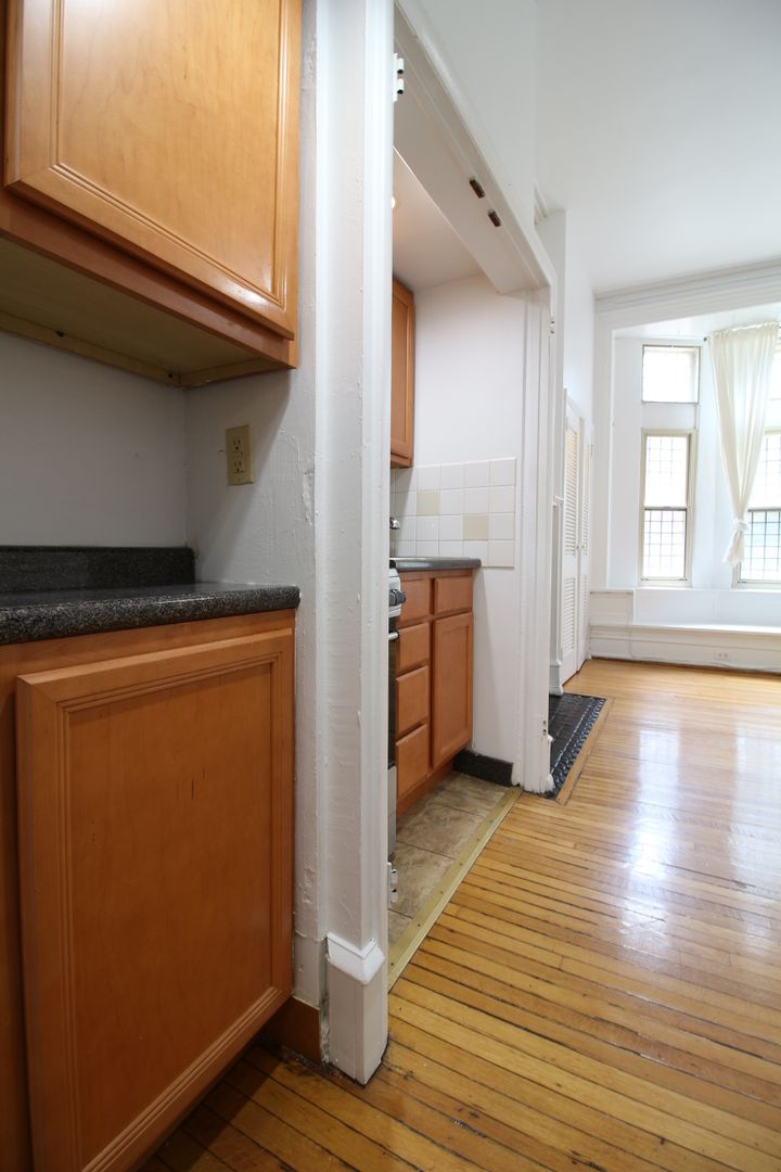 This charming one-bedroom apartment features hardwood floors throughout, large windows that fill the living room with natural light, and a beautiful decorative fireplace. The unit also includes a modern galley-style kitchen with updated appliances, a spacious bedroom with excellent closet space, and access to on-site pay-to-use laundry and additional storage.